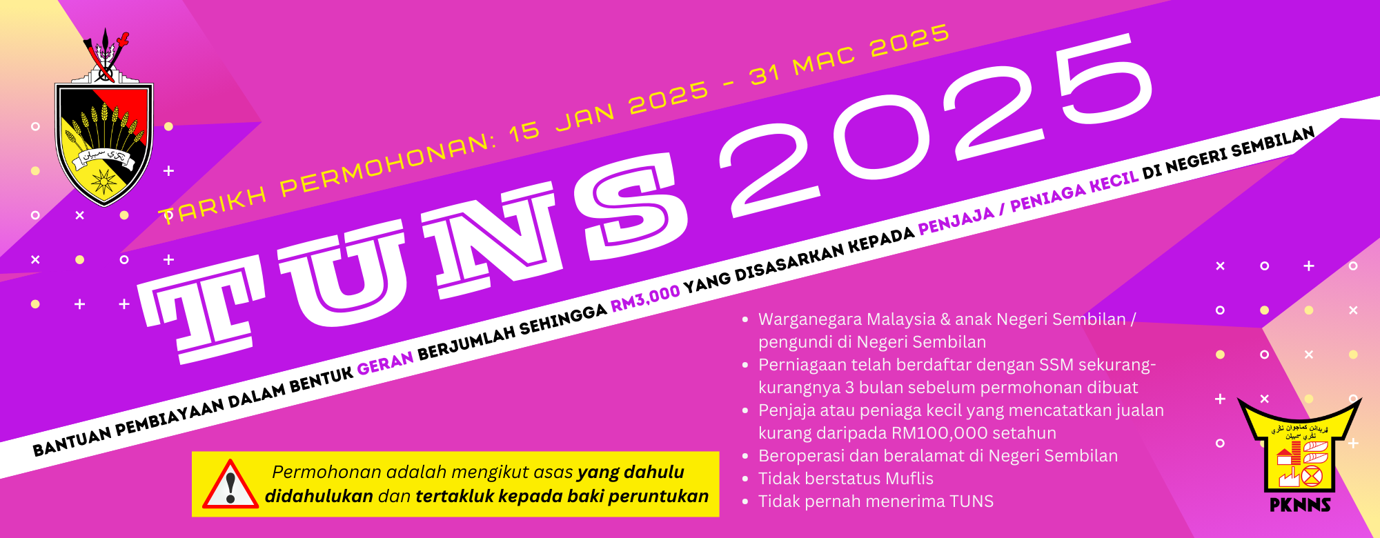 TUNS merupakan bantuan pembiayaan secara geran berjumlah RM3,000 yang disasarkan kepada penjaja dan peniaga kecil di Negeri Sembilan. Objektif utama penubuhan TUNS ini adalah supaya lebih ramai golongan usahawan pada skala ini berjaya diwujudkan melalui inisiatif ini. Di samping itu juga diharapkan agar bantuan ini dapat meningkatkan perniagaan sedia ada para usahawan agar melonjak ke satu tahap yang lebih baik dari sebelumnya. TUNS juga secara tidak langsung dapat membuka lebih banyak peluang pekerjaan di samping membantu merangsang pertumbuhan ekonomi. Melalui Belanjawan Negeri Sembilan 2025 yang bertemakan 'Bersama Membina Negeri Madani’, Kerajaan Negeri Sembilan bersetuju untuk meneruskan inisiatif TUNS untuk tahun ketujuh pada tahun ini dengan peruntukan berjumlah RM3 juta